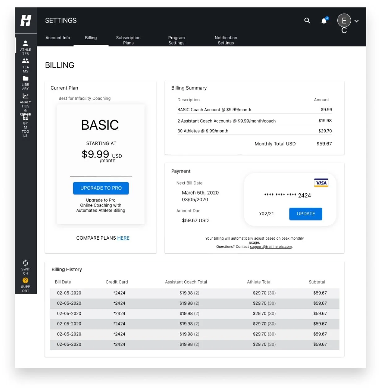 With changes to the pricing model, this also meant that coaches would not be billed the same amount each month. This meant having a clear billing history for review would be important to coaches.